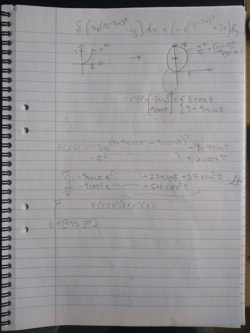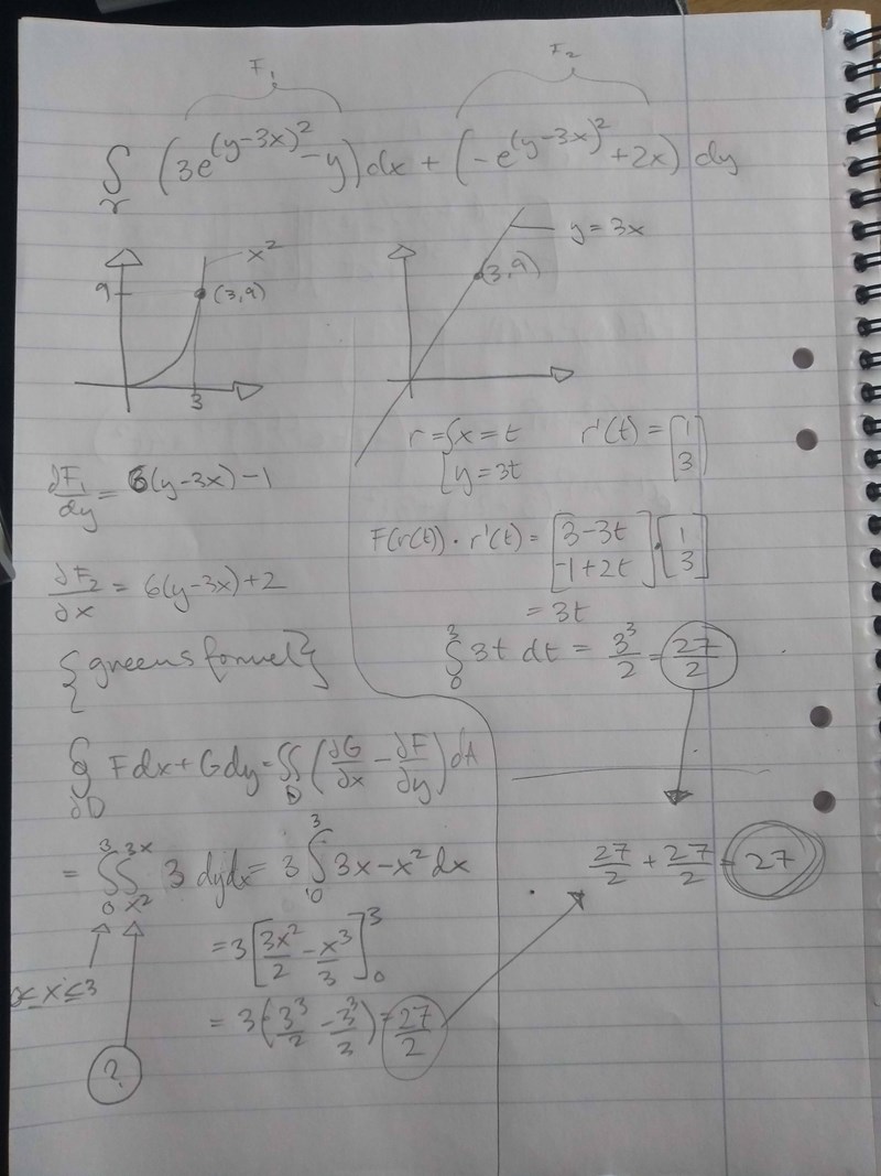 jag har valt parametriseringen r = (t,3t) och använder mig av stokes sats. Jag har sutit med denna uppgift i mer än 4 timmar och förstår inte vad jag gjort fel