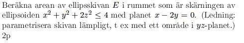 Jag skulle börja med att rita upp ellipsoiden och planet ,så att jag får en känsla för ellipsskivan är orienterad. Utan att rita upp den kan jag inte förstå ledningen - varför skulle det vara lämpligt med ett område i just yz-planet?