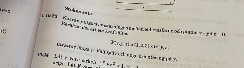 Skärningen mellan sfären och planet är en cirkel med radie 1 som ligger i planet. Du kan välja som integrationsyta för Stokes den cirkelskiva som definieras av cirkeln. Eftersom denna cirkelskiva ligger i planet så har den samma enhetsnormal som planet, dvs ±1,1,13.