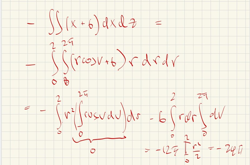 Du har -x+6dxdz, sedan går du över till polära koordinater, men då gäller x = rcosv och dxdz = rdrdv.