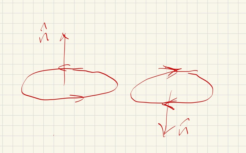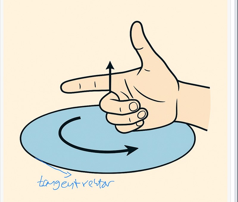 Okej men såsom du ritade tangentvektor i förra bilden #6 så är det medurs. Då måste normalen vara riktad nedåt enligt högerhandsregeln