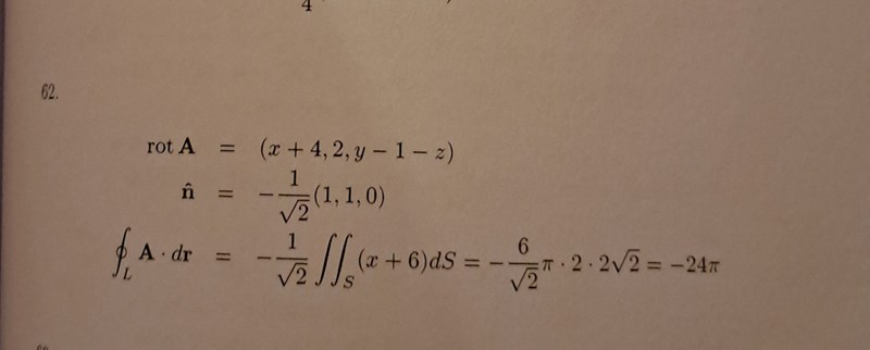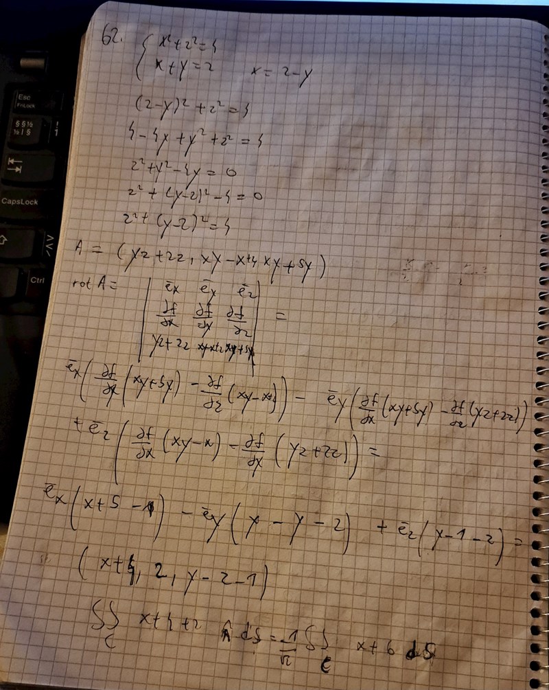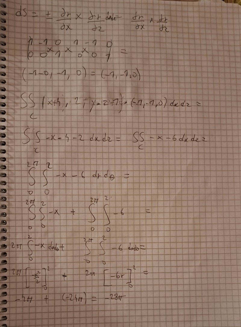 I den första bilden är det lösningsförslag till uppg 62 och jag förstår inte varför x inte räknas med i integralen samt var de får 2*2*sqrt(2)*pi ifrån? Jag gissar att det är ellipsens area. Men hur får man fram denna ellips utifrån hur jag försökte lösa ekvationssystemet i andra bilden? En annan sak jag undrar över är det här med enhetsnormalen,  facit använde sig av -1/sqrt(2)(1,1,0) vilket verkar komma ifrån planet. Men varför normerar de den?  Ibland är dS=n(hatt) dS och ibland är det dr(u,v) /du×dr(u,v)/dv.
