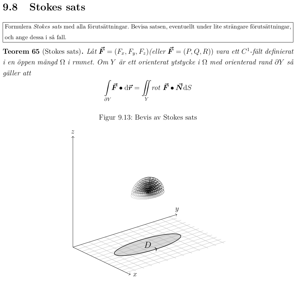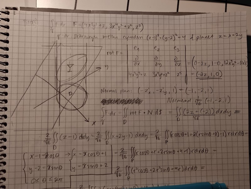 Jag använder då Stokes sats, och har beräknat rot F=(-2z, 1, 0) och planets normal=. Men nu förstår jag inte riktigt vilken yta jag ska integrera över. På (den inspelade) föreläsningen sa de att "man kan välja"? Jag fattar inte riktigt konceptet. Skärningen är ju inte heller sluten, jag gissar att jag då måste sluta den? Tacksam för tips!