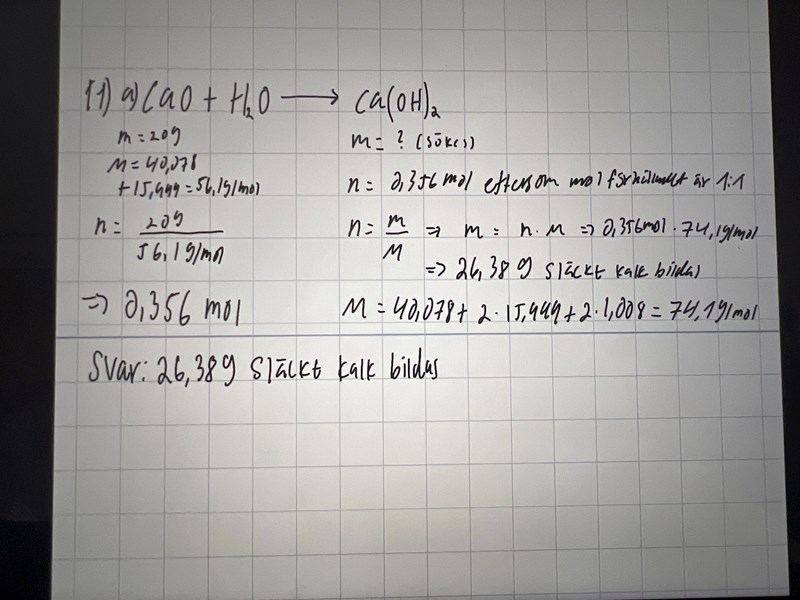a) Skriv formeln för reaktionen. b) Beräkna massan släckt kalk som bildas av 20,0 g bränd kalk.