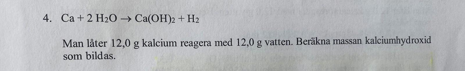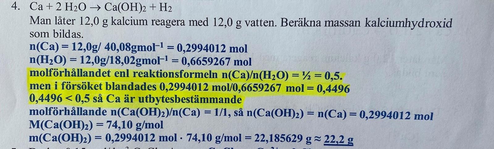Därför måste man kolla vilket ämne man har "minst" av, och sedan räkna med det. Nu hade du tur, eftersom det är kalcium som är det man har "minst" av. Det är det facit gör i det gulmarkerade.