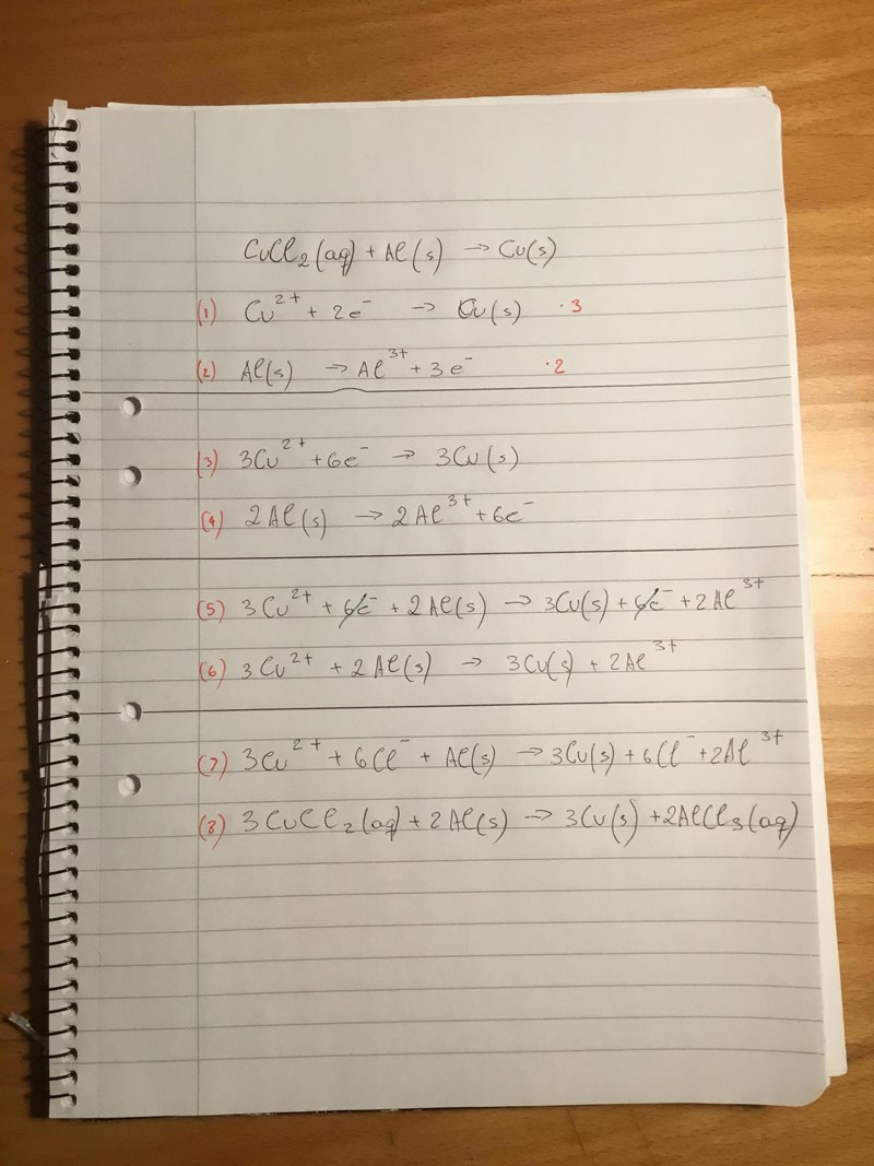 -> 3Cu (s) + 2 AlCl3 (s) . Men hur kom man fram till det framkommer här. Och jag hänger inte med, alla dessa laddningar och i visa delar så verkar det också vara övertydligt, jag förstår inte heller del 7 där 6 Cl- plötsligt bli 6. Men jag förstår att det är så man gör men ändå inte.