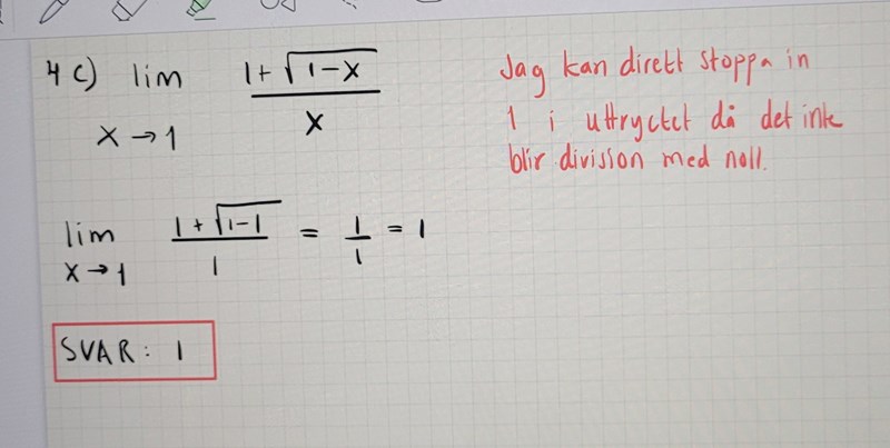 Här har vi bara ett uttryck, så det som sagts hittills har sin giltighet. Om vi däremot låter uttrycket bilda en funktion f, så måste vi ange definitionsmängden för den funktionen och om vi håller oss till Df = mängden av x sådana att x<=1, så är f kontiuerlig på randpunkten x=1. Högergränsvärden är här inte tillåtna eftersom vi då hamnar utanför Df.