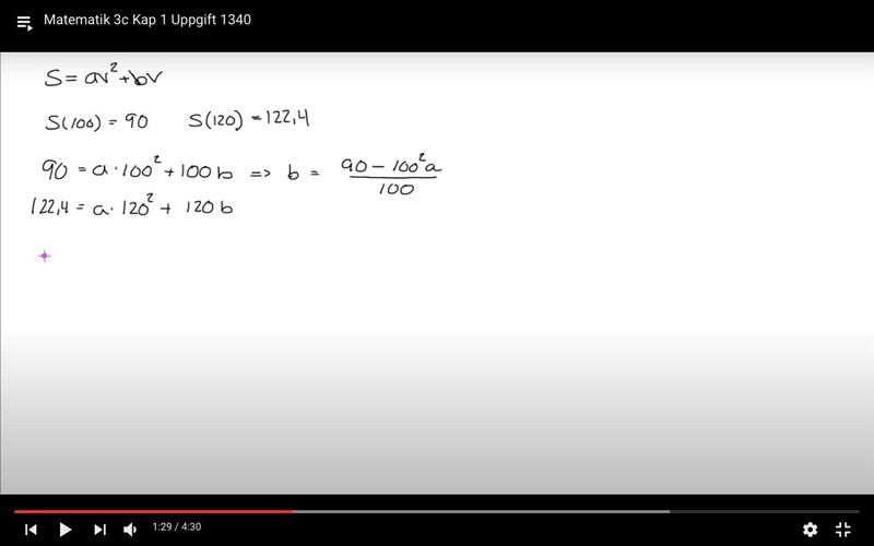 Stoppsträckan hos en bil kan beskrivas med funktionen s(v)=av^2+bv där s är stoppsträckan i m vid hastigheten v m/s. Bestäm konstanterna a och b om vi vet att s(100)=90 och s(120)=122,4.