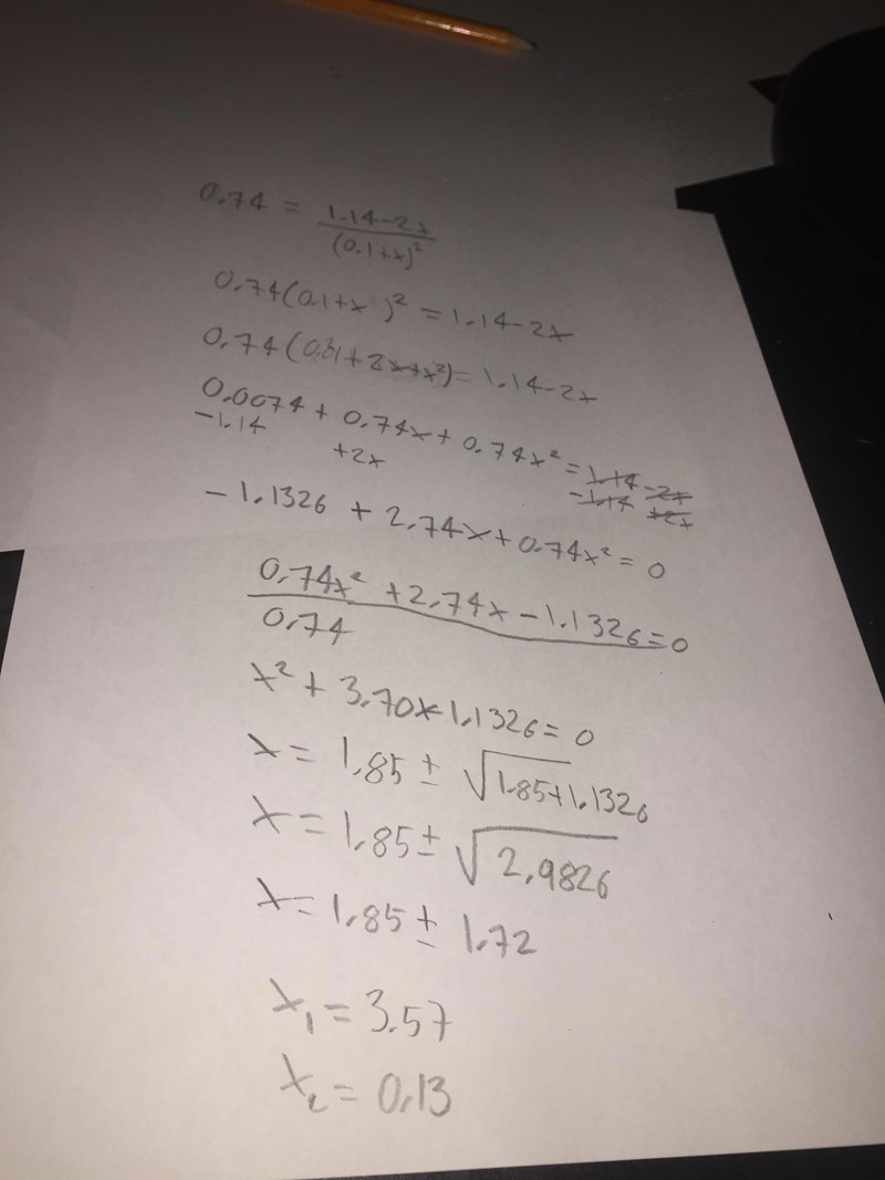 Såhär ser mina beräkningar ut, det är fortfarande fel. Jag ser inte vad jag gör för misstag, ser du det? Sätter in båda x-värden i jämviktsekvationen men får inte fram 0.74.