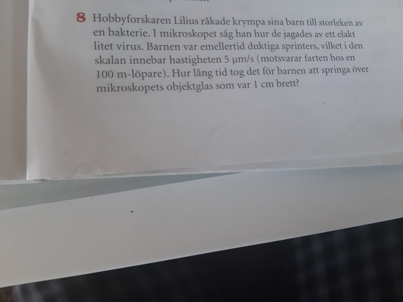 Så frågan gäller alltså vad t är då s = 1 centimeter och v = 5 mikrometer per sekund.