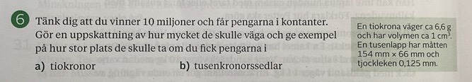 Hej! Anta att en tusenlapp väger ungefär 1 g.