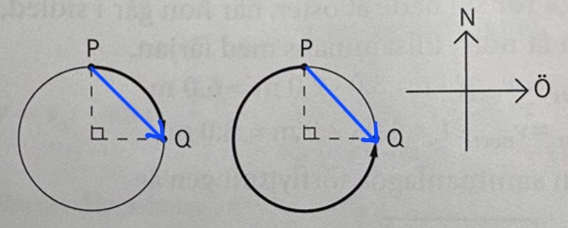 I båda fallen är startpunkten P i norr och slutpunkten Q i öster.