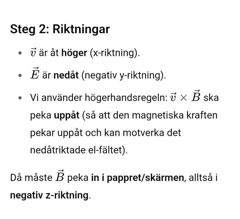Jag fick avdrag på denna fråga pga fel riktning. Jag tänkte att strömmen är rörliga partiklar och då måste partikeln peka åt höger och om E-fältet ska vara vinkelrät mot hastighet hos partikeln så måste även B-fältet vara riktad uppåt så att den är också vinkelrät. (Såg detta nånstans i university physics kursboken). Hur ska man bestämma det korrekt via högerhandsregeln om man tänker att tummen är hastighetsriktning åt höger ? jag var ganska snurrig på denna fråga.