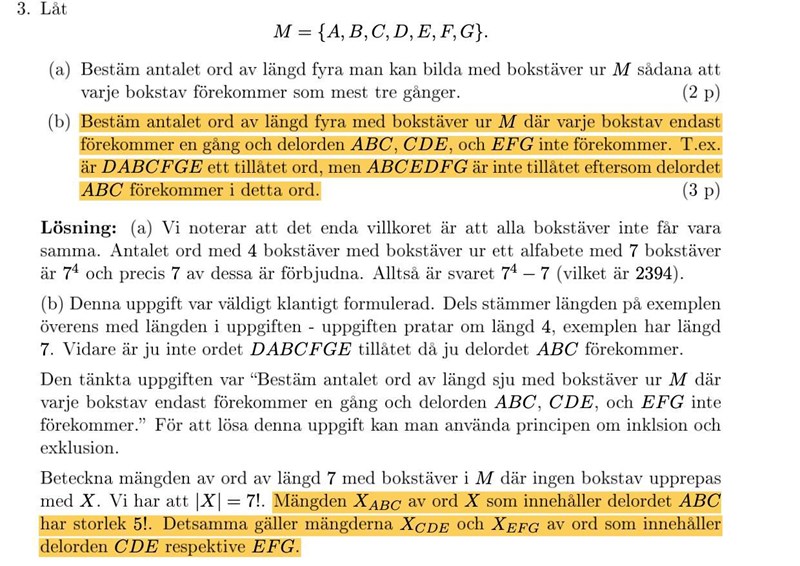 Om vi ska räkna alla ord som innehåller sekvensen ABC kan vi tänka på "ABC" som en enda bokstav, eller en "enhet", som ska finnas någonstans i ordet. Ordet ska alltså innehålla dessa delar: "ABC", "D", "E", "F", "G". Fem saker alltså, och dessa kan vi ställa i 5! ordningar. Så antal ord som innehåller delordet ABC är 5! = 120 st.