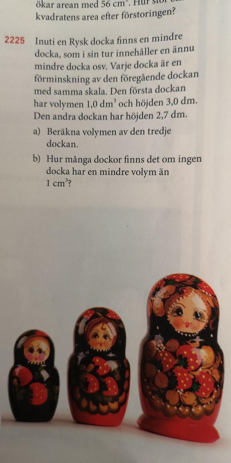 Jag är på en uppgift där jag ska räkna ut storleken på en rysk docka. Jag har längden på den första dockan, volymen på den första och längden på den andra. Uppgiften lyder: