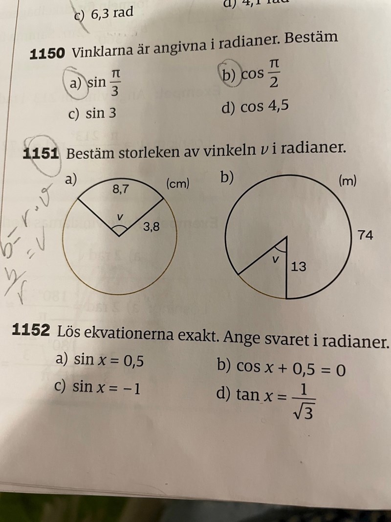 i uppgift 1151 b använder jag sambandet b=r*v och får ut 2,3 radianer. JAg gör samma i b) men får 5,6. Vad blir fel och varför?