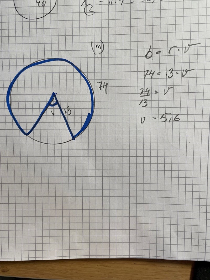 Då ska bågen vara 74 och radien 13 och sambandet gälla men vad är det som blir fel? Jag får vinkeln till 5,6