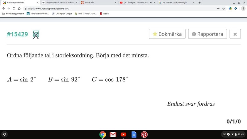 Nja, det du har markerat är vinklarna till två av uppgifterna. Om du tittar på var vinkelbenet för vinkeln v skär enhetscirkeln, så har den punkten koordinaterna (cos(v),sin(v)). När vinkeln är 2o är alltså koordinaterna (nästan 1, lite över 0). Det innebär att sin(2o) är nära 0, men positivt. Kommer du vidare?