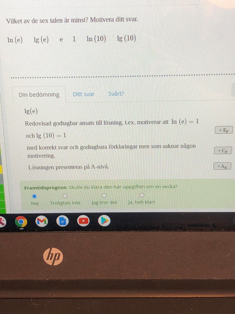 Om vi antar att du sitter med en liknande uppgift senare är ovanstående sätt att tänka på antagligen användbart: om du inte kan få ut ett exakt värde på en logaritm, testa några värden du kan räkna på och se om du kan komma fram till om dessa värdena är större än eller mindre än det riktiga. Jag tog 0,5 eftersom 2,7 < 10 vilket gjorde att lg(e) med nödvändighet skulle vara mindre än 1, eftersom 101 = 10 > 2,7; och eftersom att lg(e) med nödvändighet skulle vara större än 0, eftersom 100 = 1 < 2,7, och om det är ett tal däremellan är roten ur antagligen det snällaste talet man kan räkna på.