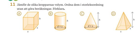 Jag vet att rätblocket är störst och att konen är minst eftersom att dens botten är cirkel, men sen hade jag svårt mellan cylindern och pyramiden.