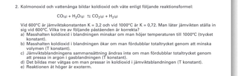 a) Om man höjer temperaturen så påverkar det jämviktkonstanten och masshalten. Så A är korrekt