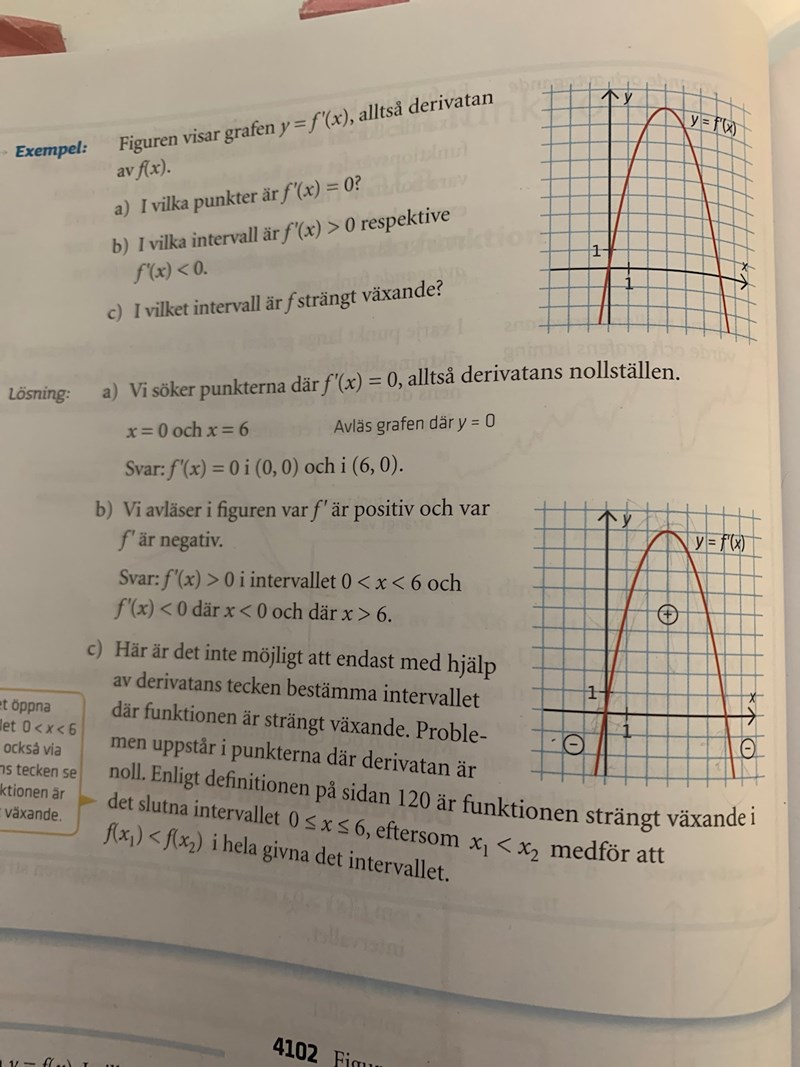 Förstod nu att jag blandade ihop derivatan av funktioner med de vanliga funktionerna. Men jag undrar bara varför skriver man att om det exempelvis är strängt växande vid intervallet -5 mindre eller likamed x mindre eller likamed -1.
