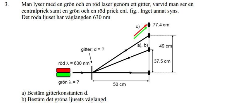 Hej! visst är det så att större våglängd betyder större vinkel, det röda ljuset borde vara vid 49 cm och det gröna vid 37,5? eller är det fel tänkt