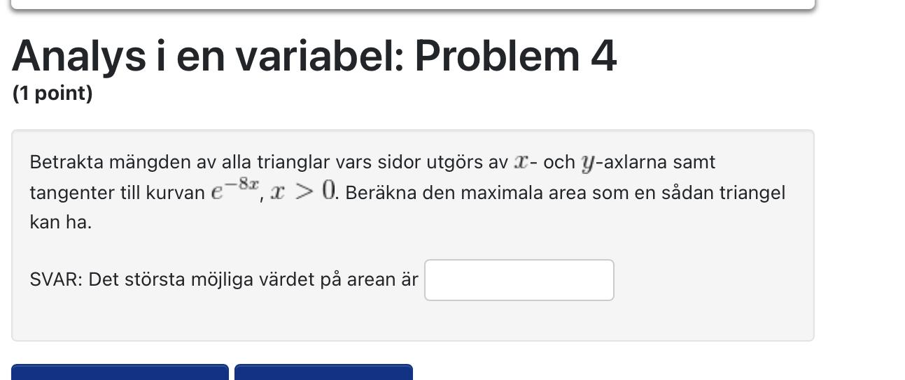 Jag har skissat en bild och kommit fram till hur triangeln bör se ut. Tar punkten för x=0 har jag kommit fram till. Därefter försöker jag att komma fram till den andra slutpunkten. Jag tänker mig om jag lyckas teckna en funktion för den tangenter som ger stört area kan jag därefter sätta y=0 och få ut x-värdet.