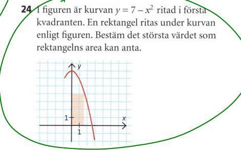 visst blir arean för rektangeln x(7-x^2) eller har jag fel vilket när man deriverar så för man att x blir ruten ur 7/3 och tillslut blir svaret 7,2 ae
