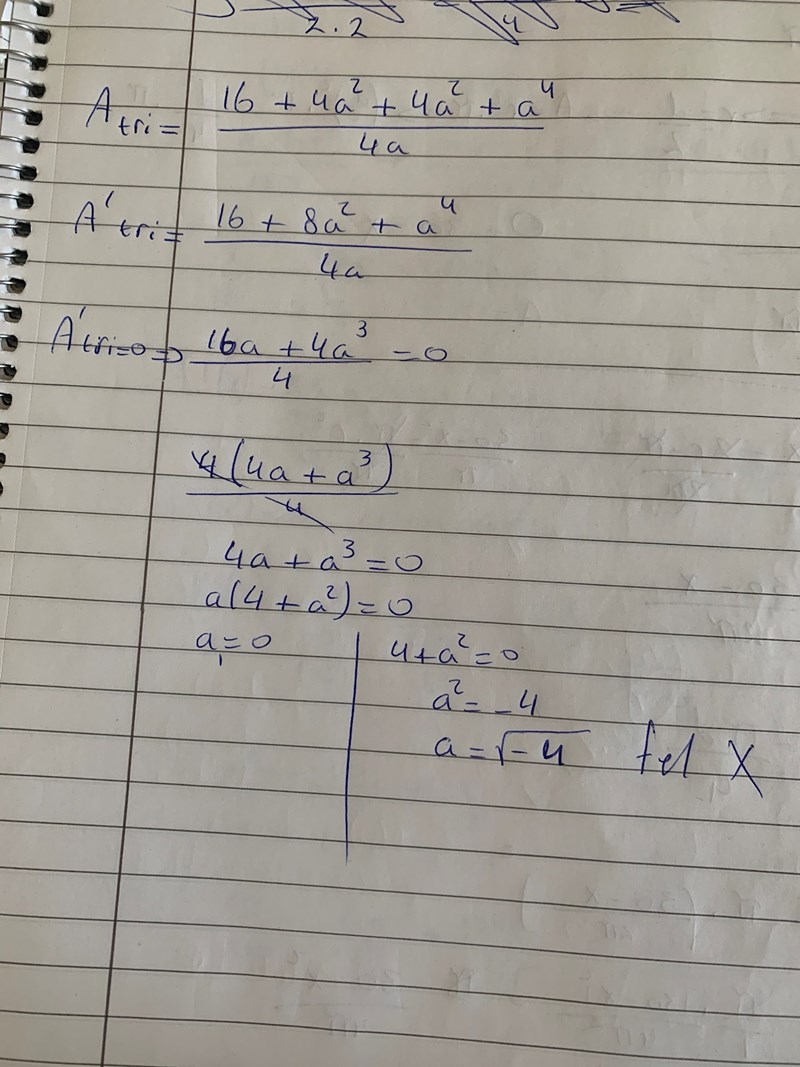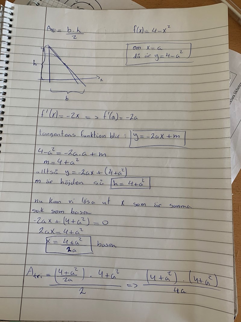 jag har gjort så för att få ut Arean av triangeln ska jag bara derivera den nu och sätta den lika med noll för att få vad a blir? Eller har jag gjort något fel
