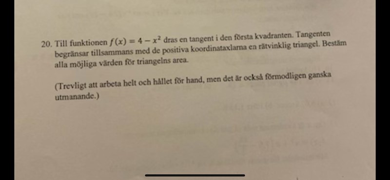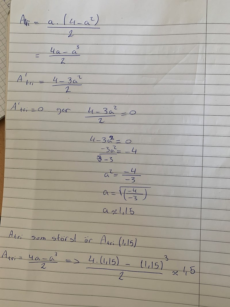 och här provade jag att ha arean av triangel som a . (4-a^2)/ 2 och när jag deriverade den då blev a 1,15 men när jag ska kolla y koordinaten för a då får jag 1,5 och inte 6,16 som är lärarens svar :( jag blir så förrvirrad bara