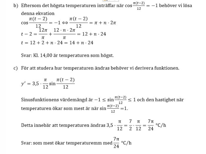 På b-uppgiften vill de veta när temperaturen är högst, dvs när y(t) har ett lokalt maximum.