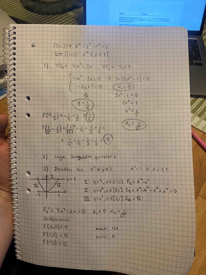 Jag har kollat gradienten av funktionen, singulära punkter (inga) och slutligen randen. Men jag hittar bara max värdet som är 1/4. Min värdet ska vara -1/4 men det hittar jag ingenstans