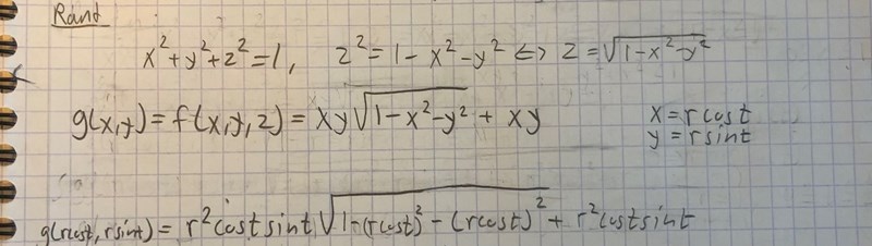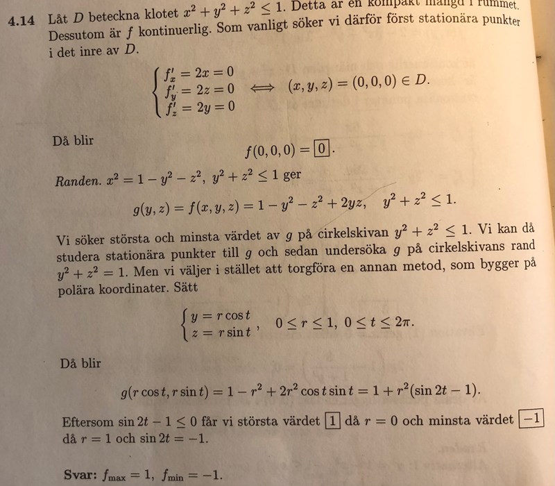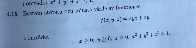 Löste ut z ifrån randen. Det gav ett rotuttryck som jag satte in i f. Ersatte sedan x,y med polära kordinater. Försöker se på uttrycket hur fmax kan bli 16/27 men ser det inte. Tänker även att vi måste begränsa vinkeln för de polära kordinaterna. Istället för 2pi använda kanske 1/2pi?