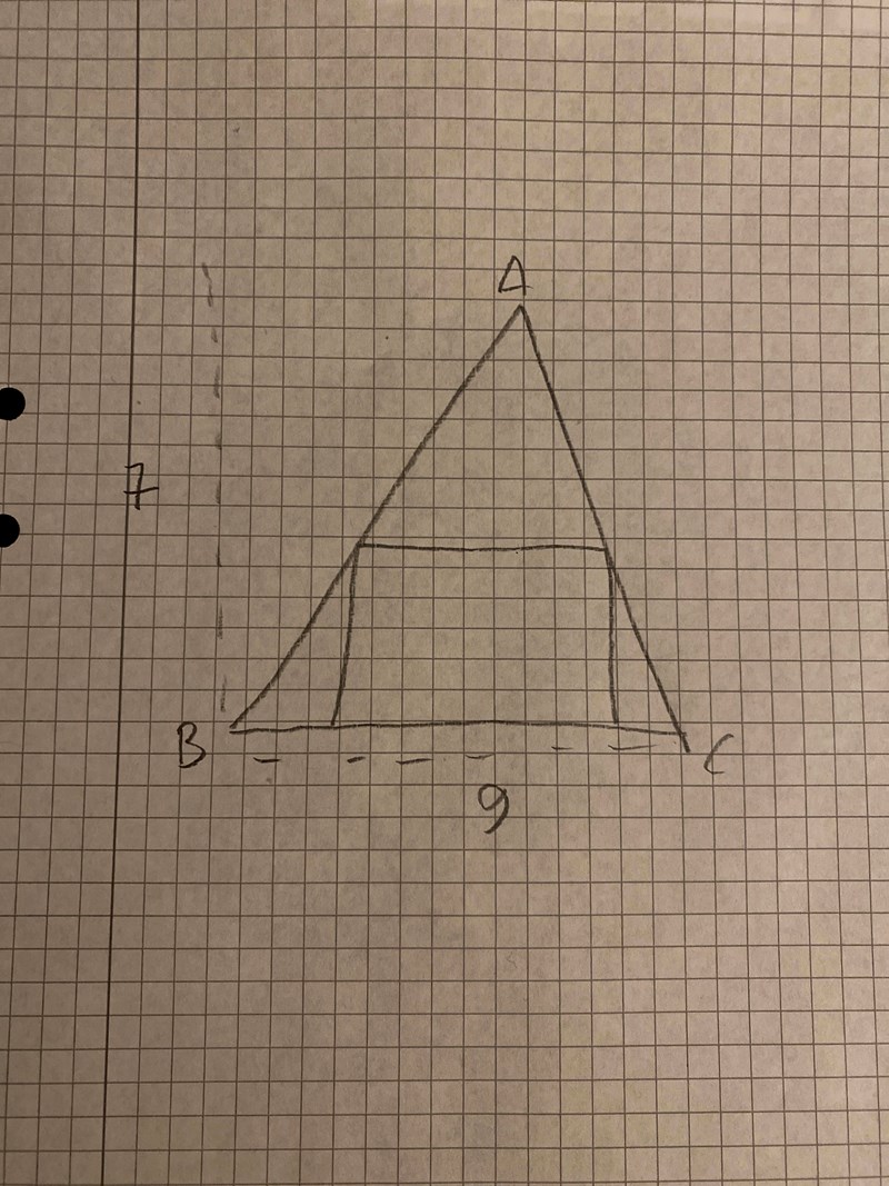 En rektangel är inskriven i en triangel med höjden 7cm och basen 9cm. Beräkna största möjliga area som rektangeln kan ha.