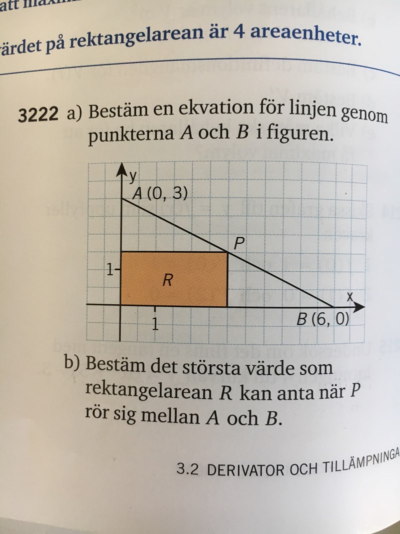 I uppgiften nedan (b) så ska man ta reda på största arean rektangeln kan ha. Ekvationen för linjen AB är y = -0,5x +3. När jag tittar på fredrik lindmarks video på yt så säger han att den längsta sidan på rektangeln kan betecknas X och den kortare -0,5x + 3, varför blir den kortare sidan ABs funktion?