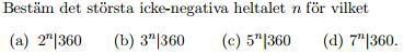 a) (2^n) innehåller n faktorer av talet 2 (bortsett från 2^0). Om talet ska vara en delare till 360 måste alltså 360 innehålla n antal 2:or. Vi faktoriserar 360 och ser hur många faktor två som finns i 360.