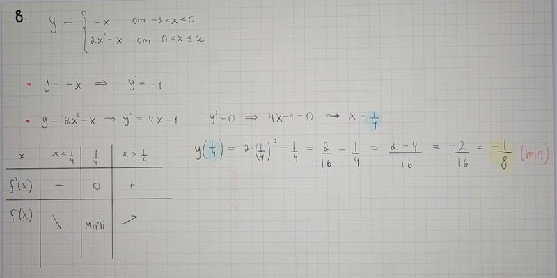 För 0 ≤ x ≤ 2 är f’ = 4x–1 som är noll för x = 1/4
