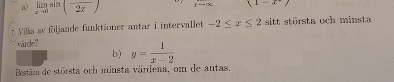 eftersom derivatan saknar nollställen inom intervallet är funktionen antingen växande eller avtagande i intervallet så största och minsta värde hittar vi (om de finns) vid intervallgränserna.