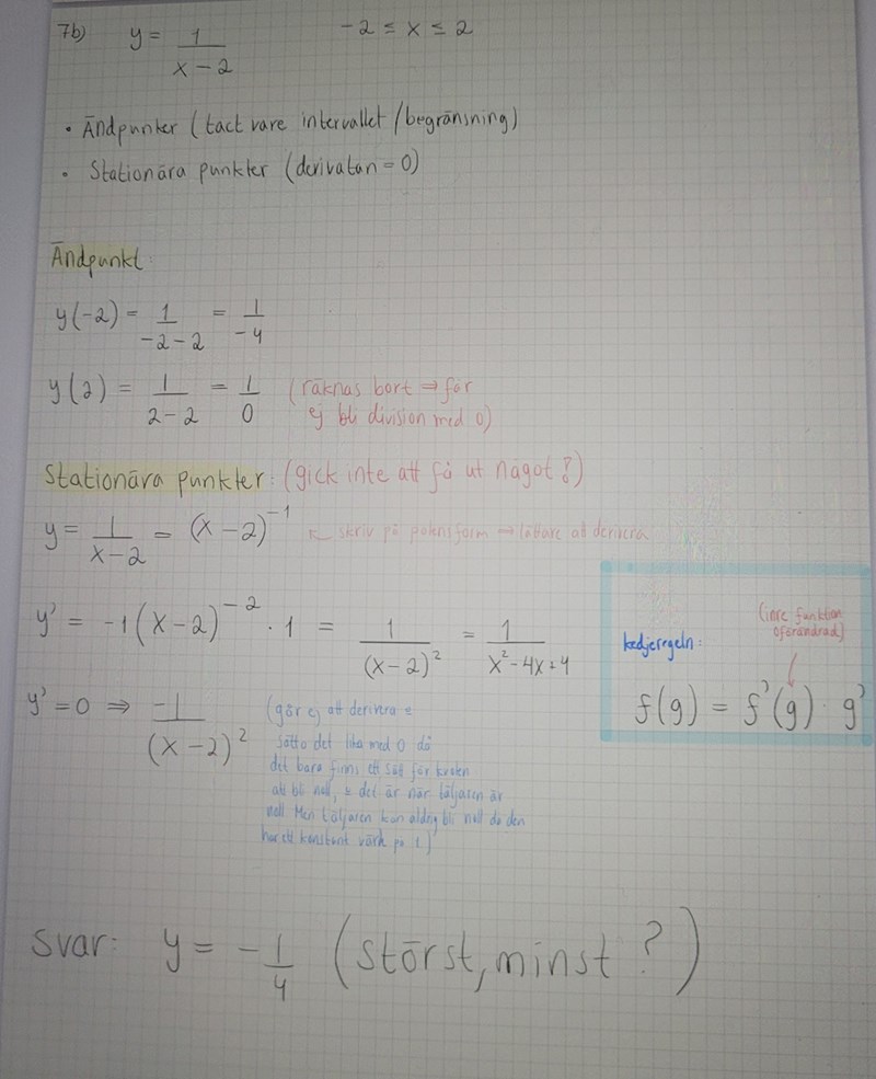 På b) så fr jag bara ut -1/4, hur ska man veta om det är största eller minsta värdet? Men samtidigt inser jag att det är det enda jag fått ut och att det måste vara största värdet?