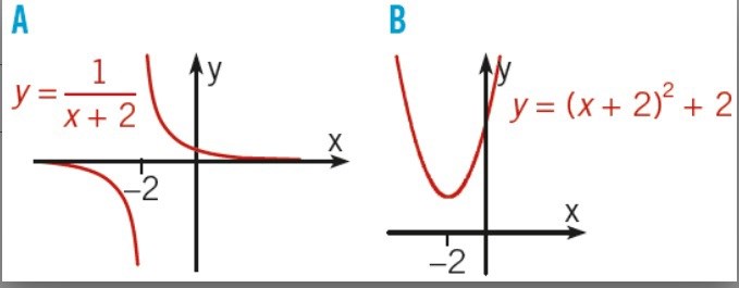 I A-grafen ser du att det finns en punkt, x=-2, där det sker ett hopp i grafen. Om du tänker dig att du sätter in att x=-2 i funktionen är det ganska naturligt varför: du tvingas dela med 0, vilket gör att värdet för den punkten inte är definierat.