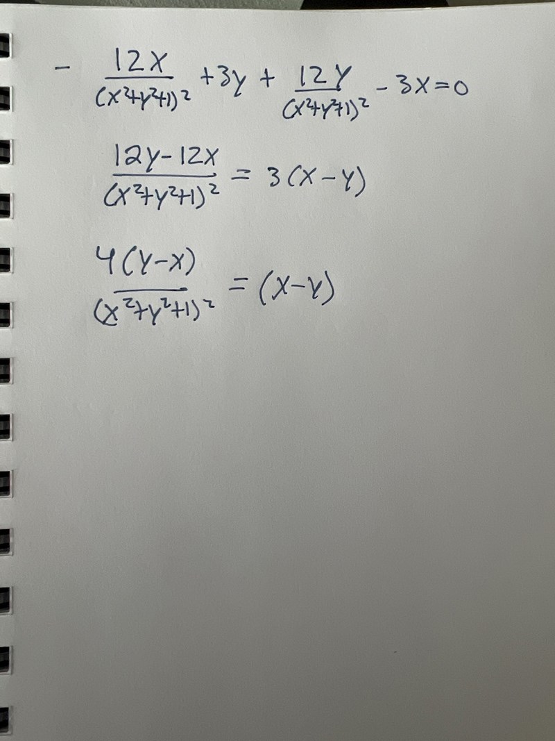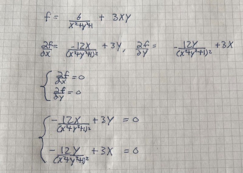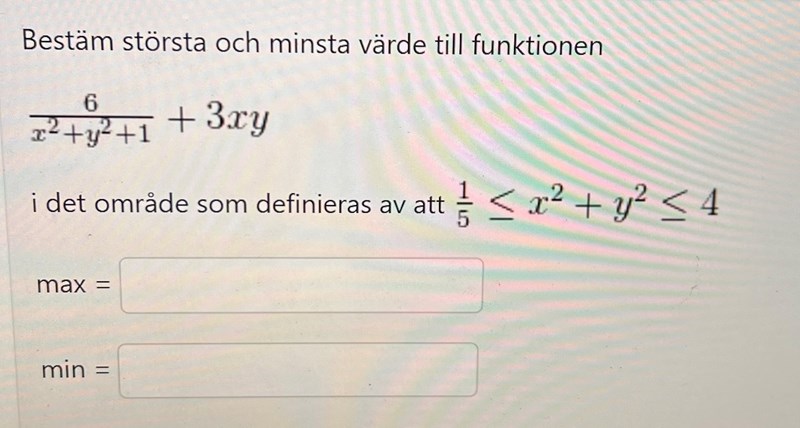 jamolettin skrev:Lyckas få x=y, vilket i sin tur ger lösningarna x=y=0. f(0,0)=6.