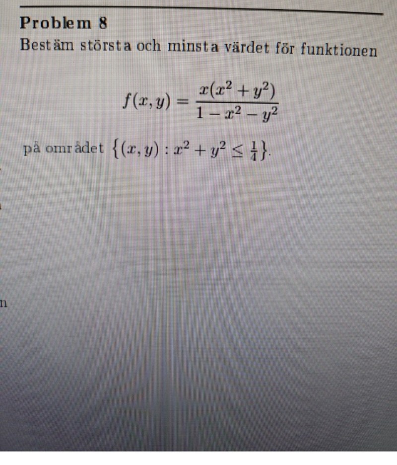 f(x, y) = (polära: x = rcosv, y = rsinv) = f(r, v) = r3cosv/(1-r2). På randen är r = 1/2.