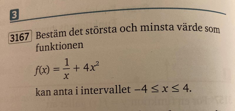 Ritade i Geogebra när jag inte kunde lösa den och då såg jag att den drog mot oändligheten. Undrade om det gick att lösa utan att rita, men är x=0 anledningen till att största och minsta värde saknas?