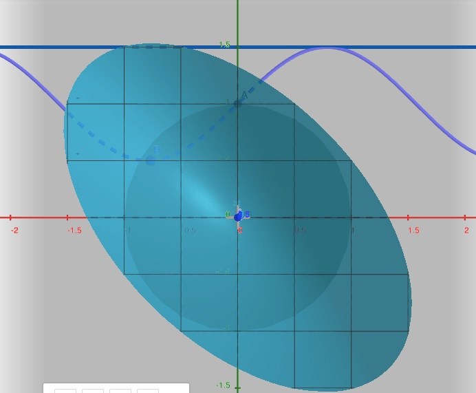 Nedan är min elliptiska funktion, och cirkeln med radie 1 innanför är alltså området där jag ska finna största och minsta värde. Sinusfunktionen som löper tvärs över är den parametriserade funktionen, och den raka linjen ovanför är alltså den övre gränsen (värdet 3/2) som ligger utanför randen, och alltså ej är ett största värde till funktionen? Eller är den det?
