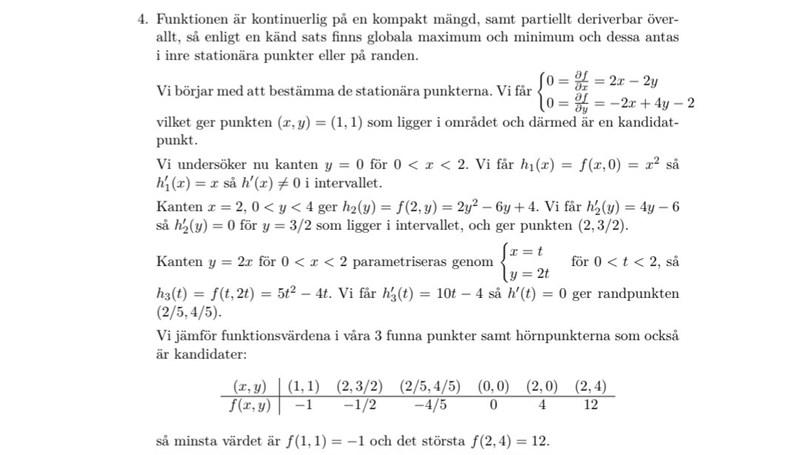 Hur ska man lösa denna uppgift när man hittat inre stationär punkt som finns i området? Känns som att min sätt att lösa ger ej rätt svar. Jag vet ej om runda paretenser i punkterna innebär att ändpunkterna ej är inkluderade?