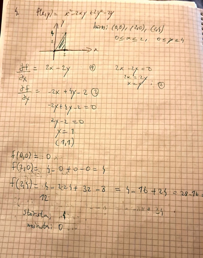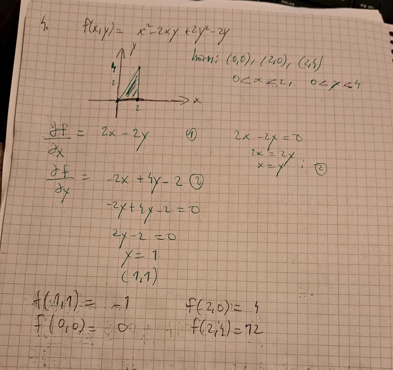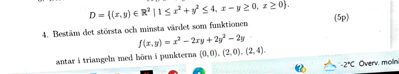 Jag stoppade in alla 3 punkter för att jämföra med (1,1). Då får jag f(0,0)=0 , f(2,0)=4, f(2,4)= 12 och f(1,1)=-1. Så minsta är -1 och största är 12?