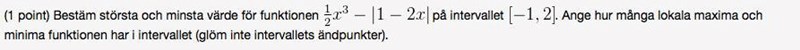 rapidos skrev:Diskontinutetspunkten är x=1/2. Betänk också att ändpunkterna kan vara max och min. Din beräkning är inte bifogad.