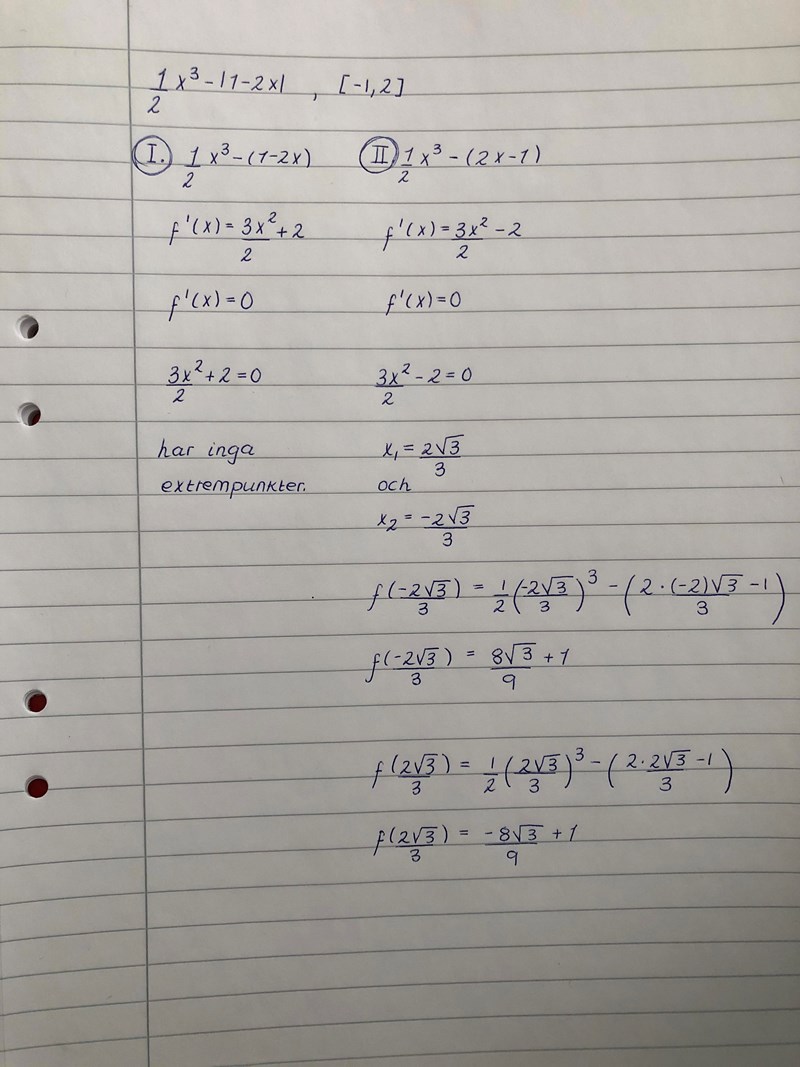 Den dök upp! Du har beräknat nollstället för f'(x) för x>1/2 fel, skall vara X=+2/. Sen är det en liten bit kvar bara. Har du geogebra eller dyl? Där kan studera funktionen.