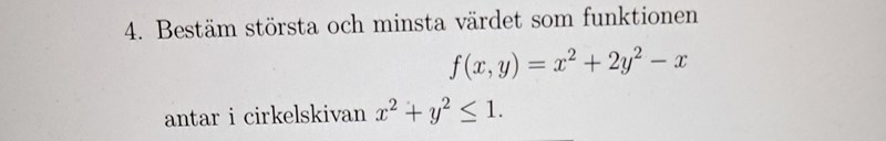 Största och minsta värde i cirkelskiva x^2+y^2<=1